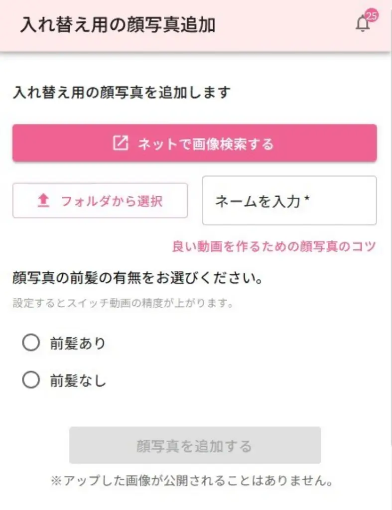 用意できたら、メニューの「顔写真一覧」から、「+新しい顔写真を登録」へと進みましょう。(最大20枚まで登録可能)