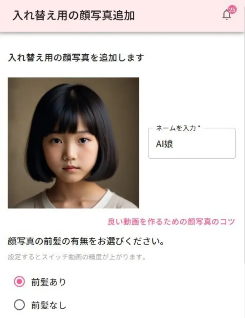 AIで作ったので「AI娘」という名前にしました。 前髪があるので「前髪あり」にチェックを入れて(←ココ重要)、「顔写真を追加する」をクリックしたら登録完了です。