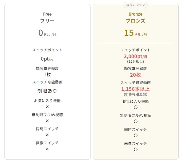 FACE SWITCHの料金体系は、無料のフリーか、有料のブロンズの2つのみとわかりやすい仕様。