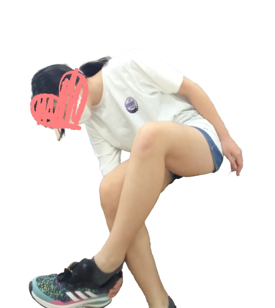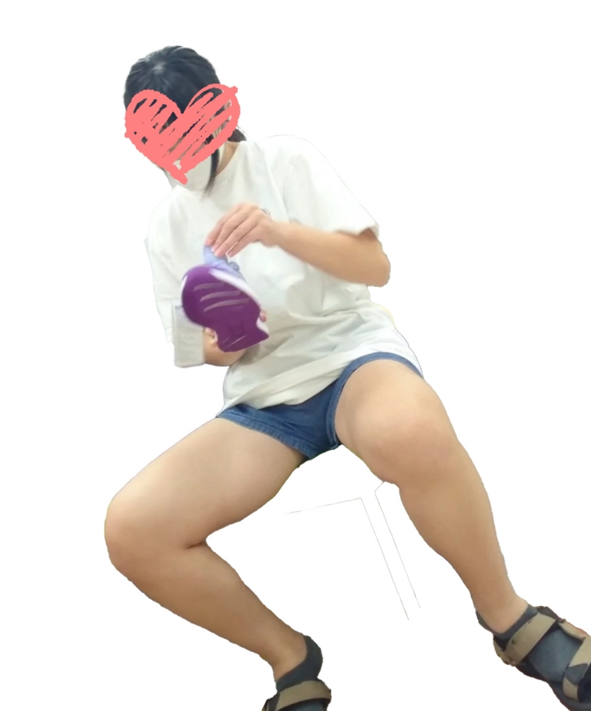 靴を脱ぎ終え、お母様役が新しい靴を差し出したところで開脚ポーズ。