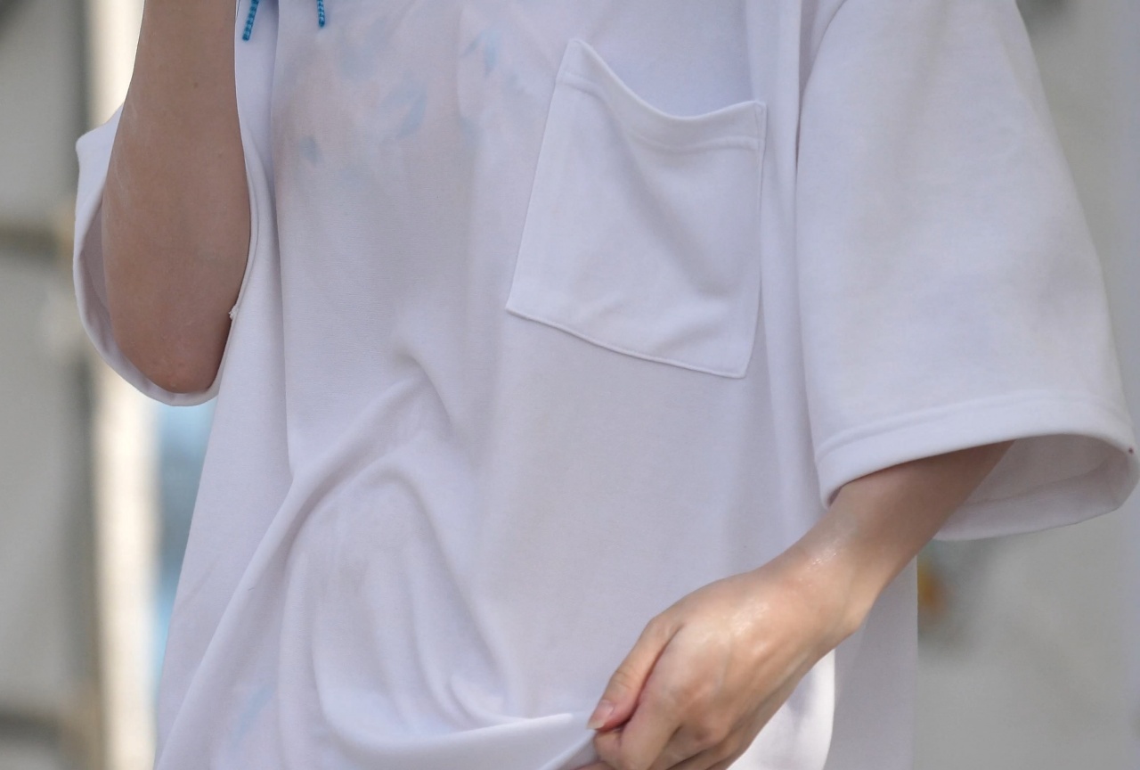 濡れた Tシャツからは中が透けて見ております(水着パンツだけどね)
