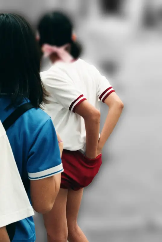 赤いミニゼッケンを装着した、華奢スタイルのモデル様の斜め後ろショット。