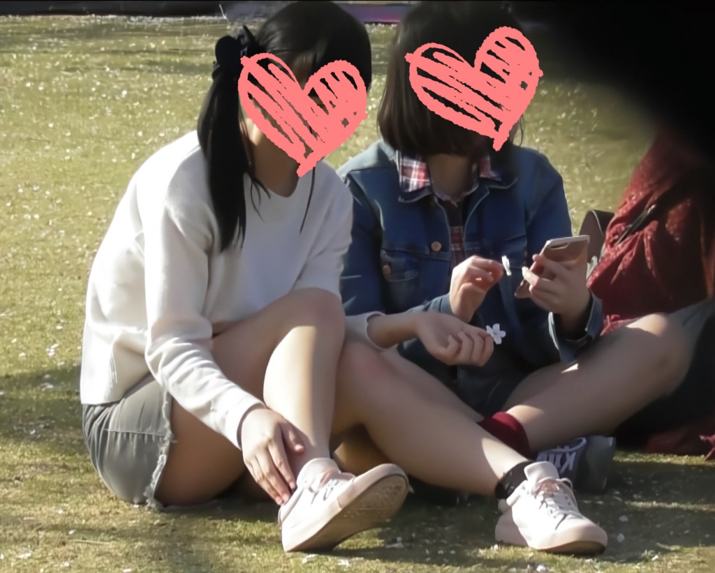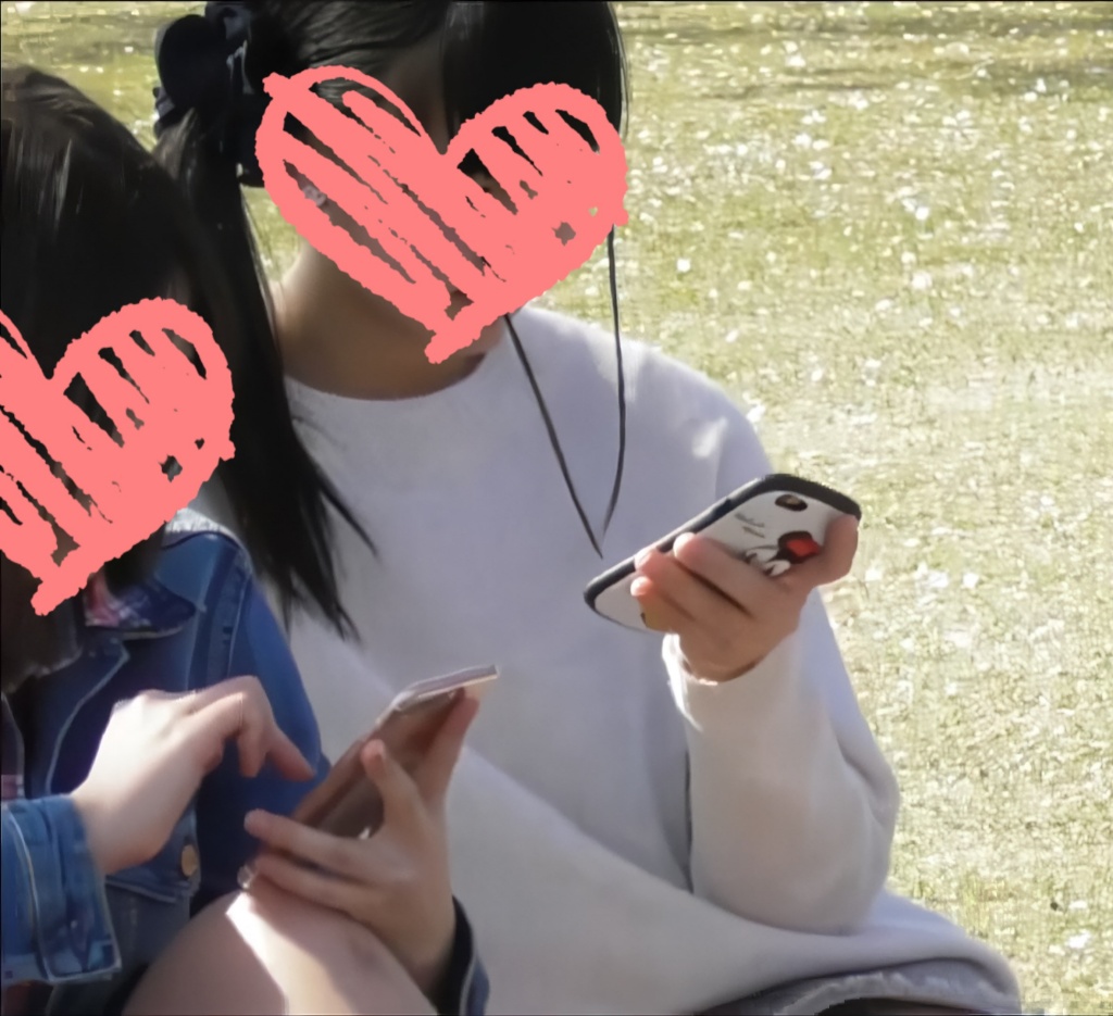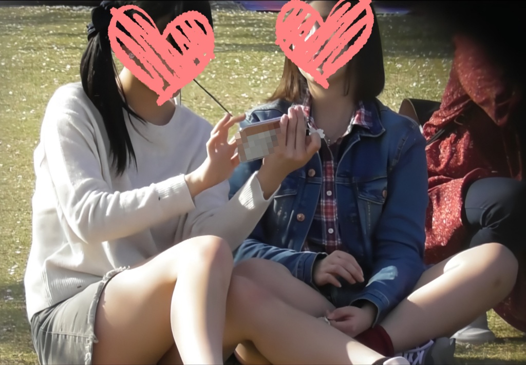 芝生の上でスマホをいじる数名の私服女子グループ。