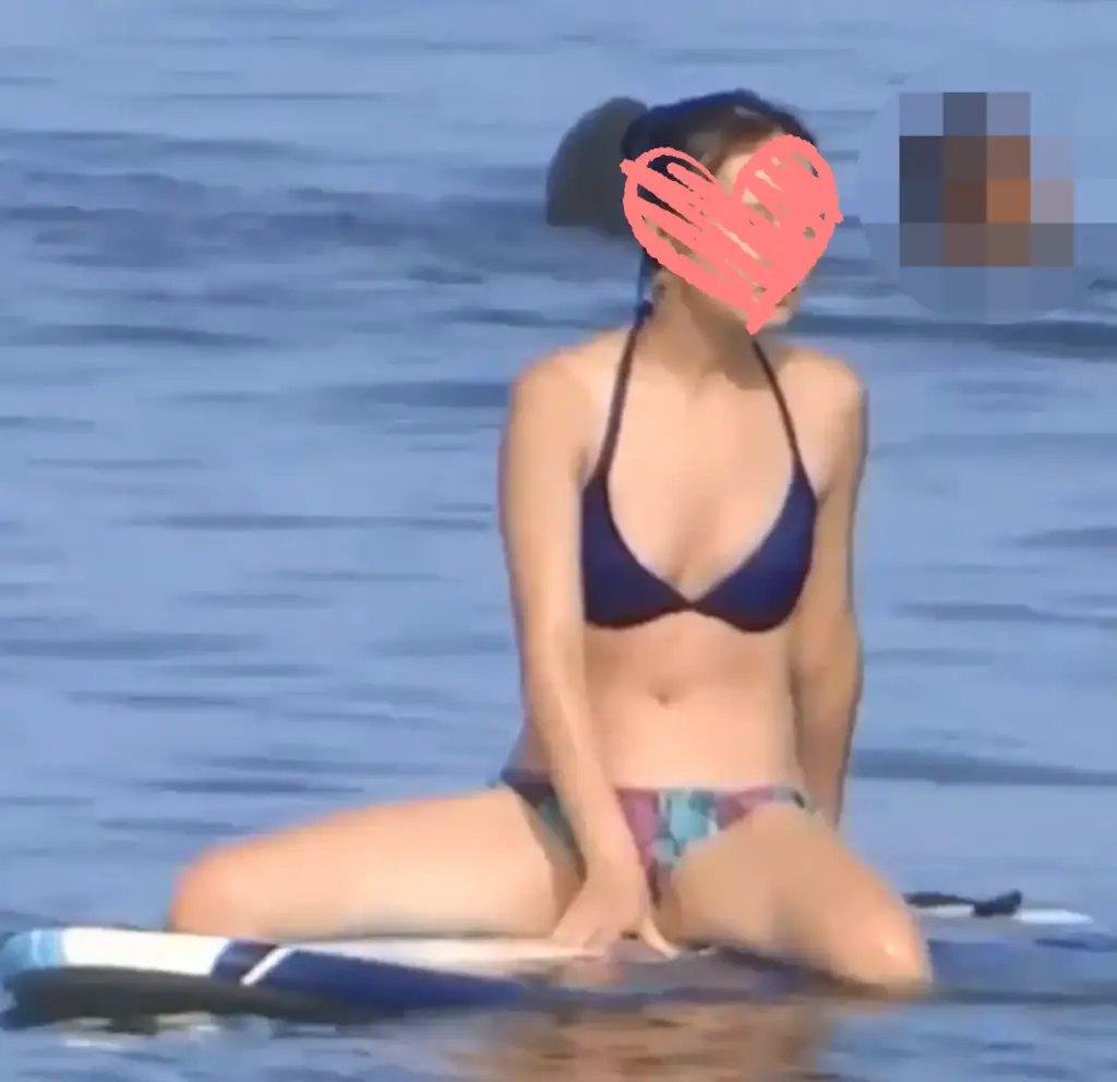 まもなくボードにまたがると・・・ん? ビキニブラのフチから異物が見えているような…