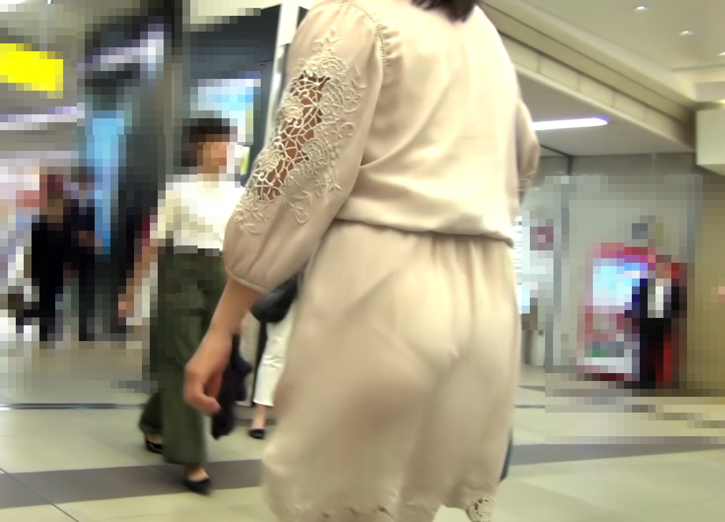真後ろから斜め後ろへとポジションを変更しながら、じっくりとその透けパン具合を粘着撮りするサラスさん。