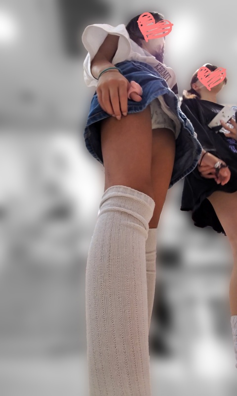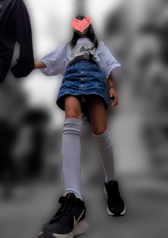 姿撮りも終わり歩き出したところで、まずは妹ちゃんのデニムスカートの中がチラ見え。